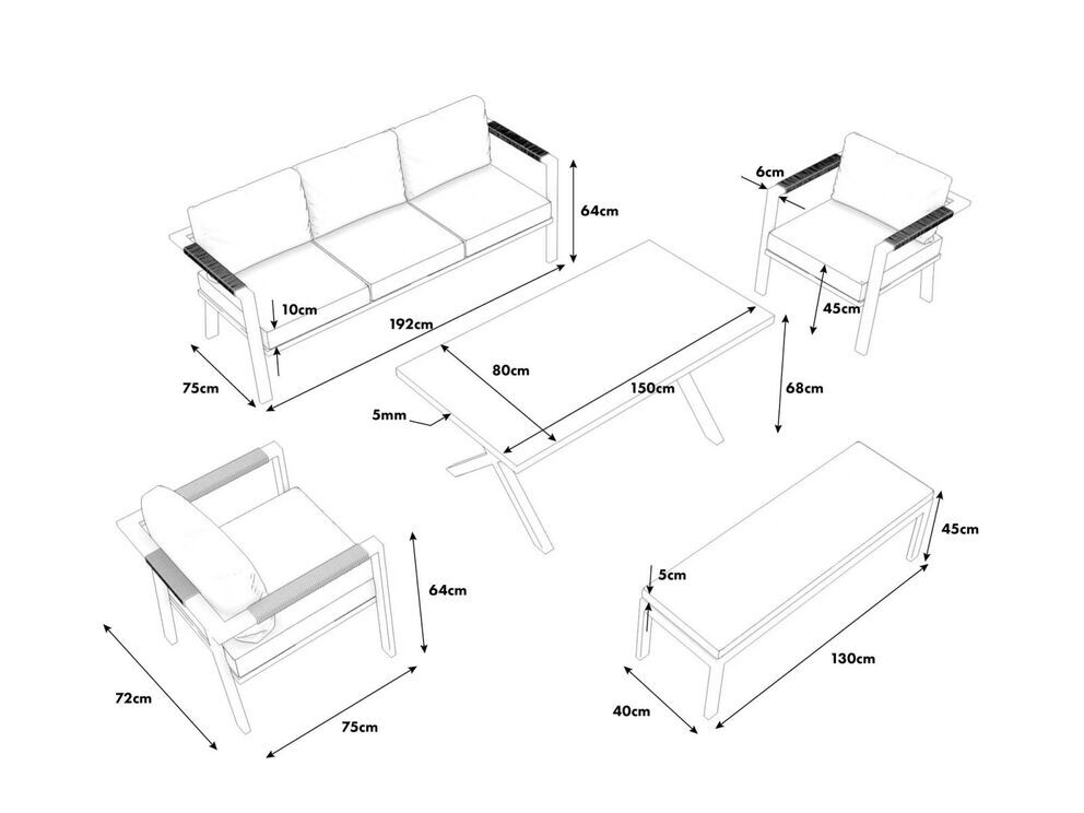 Besonderes Highlight des Sets ist das elegante Rope-Geflecht in Grau, das sich über die Armlehnen der Sessel und des 3-Sitzers zieht und einen stilvollen Kontrast zum weißen Aluminiumrahmen bildet. Dieses Detail verleiht der Loungegruppe nicht nur eine exklusive Optik, sondern sorgt auch für zusätzlichen Komfort. Die Polsterauflagen und Rückenkissen sind inklusive und laden dazu ein, gemütliche Stunden im Freien zu verbringen.