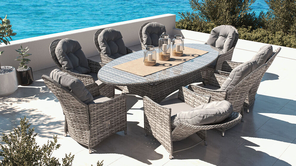 Das Ensemble besteht aus einem großzügigen ovalen Tisch und acht bequemen Sesseln mit verstellbaren Rückenlehnen, die sich ideal zum Entspannen und Genießen von Mahlzeiten im Freien eignen. Der Tisch misst ca. 220 cm in der Länge, ca. 120 cm in der Breite und ca. 75 cm in der Höhe und bietet ausreichend Platz für all Ihre Gäste. Die transparente Sicherheitsglasplatte des Tisches ist nicht nur elegant, sondern auch äußerst robust und bruchsicher.