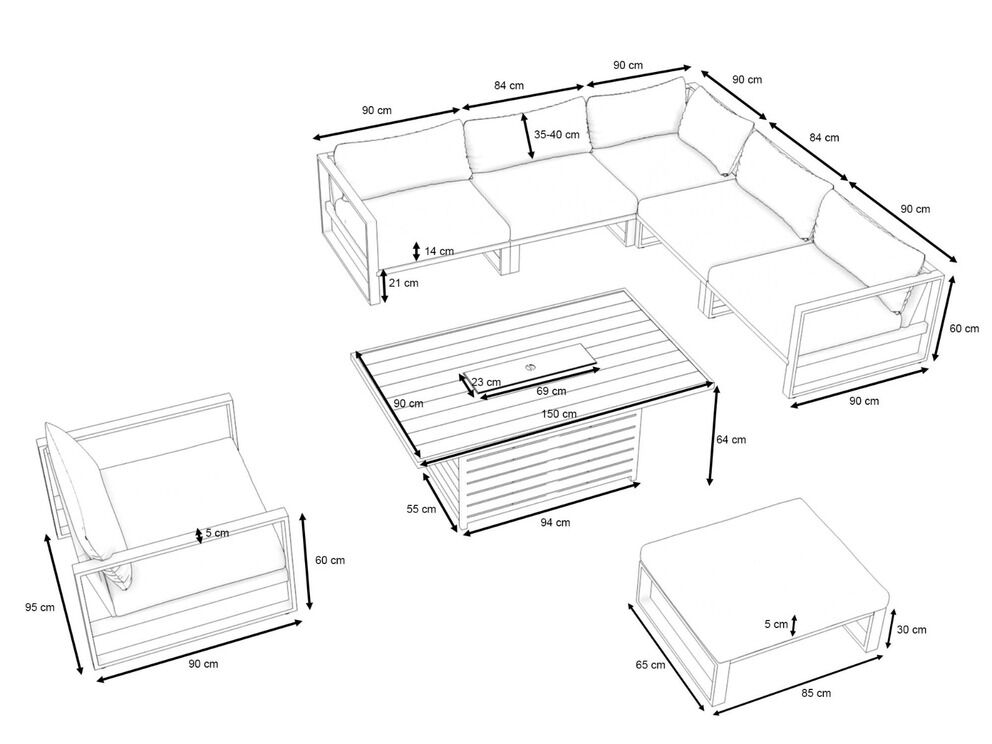 Die einzelnen Module der Lounge bieten flexible Gestaltungsmöglichkeiten und lassen sich nach Belieben anordnen. Die Maße des Ecksofas betragen ca. 90 x 84 x 60 cm, während der Mittelsessel und das Einzelsofa jeweils ca. 90 x 90 x 60 cm groß sind. Der Couchtisch hat eine Höhe von ca. 55 cm und eine Breite von ca. 90 cm, wodurch er sich perfekt in das Gesamtbild einfügt.