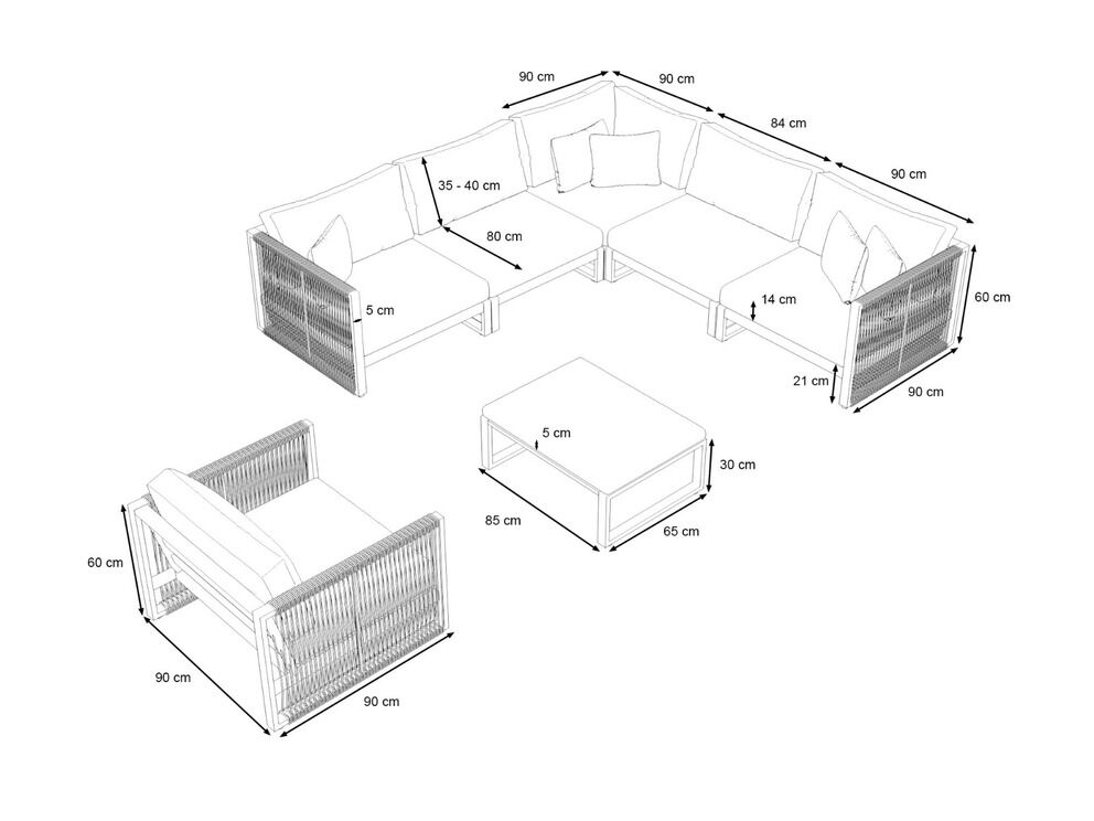Das Set besteht aus einer großzügigen Eckgruppe, einem komfortablen Einzelsessel und einem passenden Couchtisch, die alle perfekt aufeinander abgestimmt sind. Die anthrazitfarbenen Rahmen aus robustem Aluminium sind nicht nur langlebig, sondern auch pflegeleicht und witterungsbeständig. Die dunklen Rope-Applikationen an den Armlehnen setzen dabei stilvolle Akzente und sorgen für eine moderne Optik, die sich mühelos in jede Umgebung einfügt.