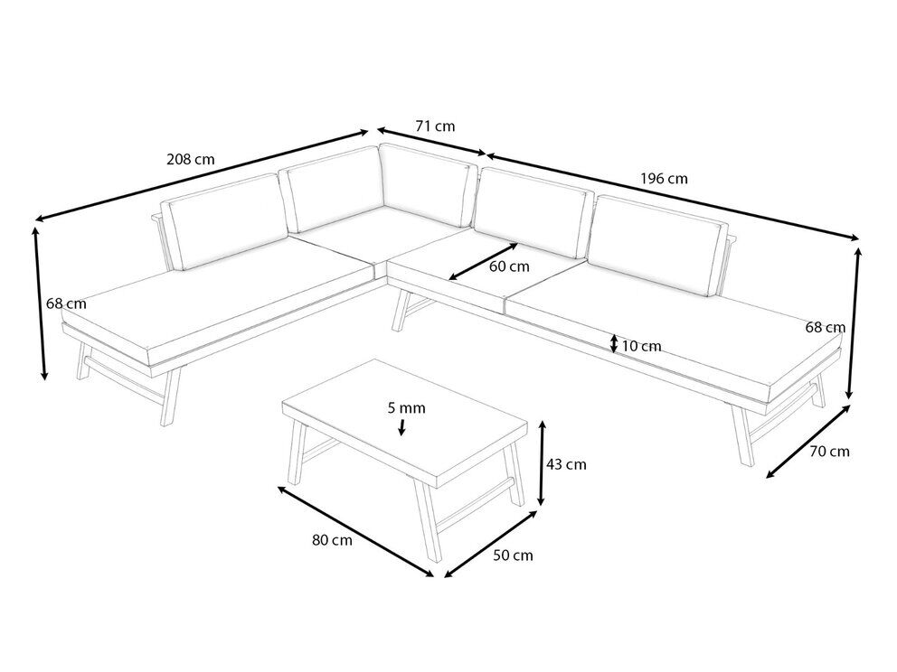 Mit Abmessungen von ca. 208 x 71 x 68 cm für das lange Sofa und ca. 196 x 70 x 68 cm für das kurze Sofa bietet die Morino Gartenlounge ausreichend Platz für gesellige Runden oder entspannte Stunden allein. Der Couchtisch misst ca. 80 x 50 x 43 cm und fügt sich harmonisch in das Gesamtbild ein.