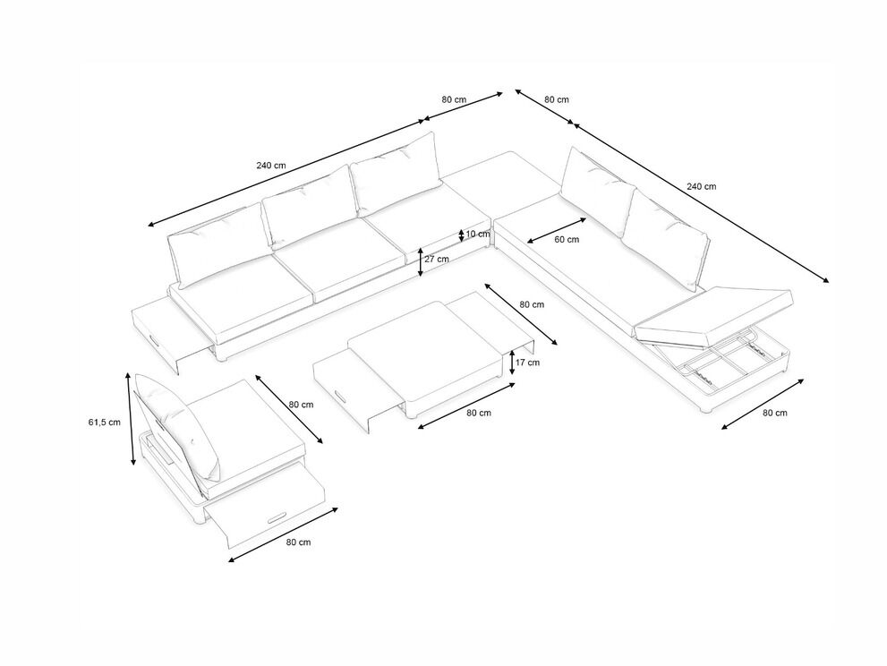 Das Set umfasst ein ca. 240 cm breites 3-Sitzer-Sofa, eine ca. 240 cm lange Sofa-Liege, einen separaten Sessel, einen praktischen Beistelltisch und einen eleganten Couchtisch. Die robusten Rahmen bestehen aus Aluminium und sind in einem trendigen Anthrazit gehalten. Die komfortablen Polster präsentieren sich in einem modischen Grau und bestehen aus 100% Polyacryl. Diese Materialkombination sorgt nicht nur für eine ansprechende Optik, sondern auch für eine lange Lebensdauer und einfache Pflege.