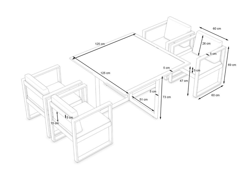 Ein herausragendes Merkmal dieses Sets ist das innovative, platzsparende Design. Die Möbel können vollständig zusammengeschoben werden, sodass sie als kompakter Würfel erscheinen. Dies ist besonders praktisch für die Lagerung im Winter oder bei begrenztem Platz auf der Terrasse. Dank der Maße von ca. 125 x 125 cm für den Tisch und ca. 60 x 69 x 60 cm für die Sessel passt dieses Set perfekt in verschiedene Outdoor-Bereiche.