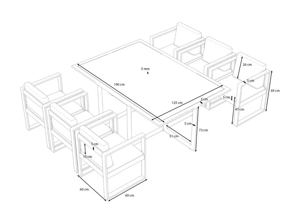 Das Set besteht aus einem großzügigen Tisch und sechs komfortablen Sesseln, die perfekt aufeinander abgestimmt sind. Der Tisch beeindruckt mit einer hochglänzenden, schwarzen Glasplatte, die nicht nur ästhetisch ansprechend ist, sondern auch äußerst robust und kratzfest. Der Aluminiumrahmen des Tisches verleiht ihm eine hohe Stabilität und Korrosionsbeständigkeit, sodass Sie viele Jahre Freude an diesem Möbelstück haben werden.