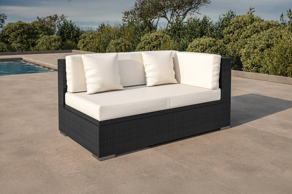 Ob als Bestandteil einer Gartenlounge oder als Balkonmöbel: Dieses Modulelement bietet Ihnen die beste Grundlage für Ihre individuelle Gartengestaltung. Das 2-Sitzer-Sofa mit linker Armlehne ist absolut wetterfest und äußerst pflegeleicht. Extreme Temperaturen zwischen -60°C und +70°C können der Polyrattanfaser nichts anhaben. Das Sofa verfügt über edle Aluminiumfüße, die dank der Kunststoffnoppen Ihren Bodenbelag schonen und einen schönen Kontrast zur flachen Polyrattanfaser bilden. Dieses Gartensofa bietet Ihnen mit seiner bequemen Polsterung besten Komfort, um stundenlang relaxen zu können. Das Sofa ist insgesamt mit bis zu ca. 300 kg belastbar. Das Sofa ist insgesamt mit bis zu ca. 300 kg belastbar. Die Sitzfläche lässt sich hochklappen. Der Stauraum darunter ist mit einer wasserdichten Kissentasche ausgestattet, die mittels Reißverschluss geschlossen wird. Alle Polster lassen sich so sicher und problemlos verstauen. Einzelne Modulelemente bieten zudem den praktischen Vorteil, Ihre Gartenlounge bei Bedarf zu erweitern und immer wieder neu anzuordnen.