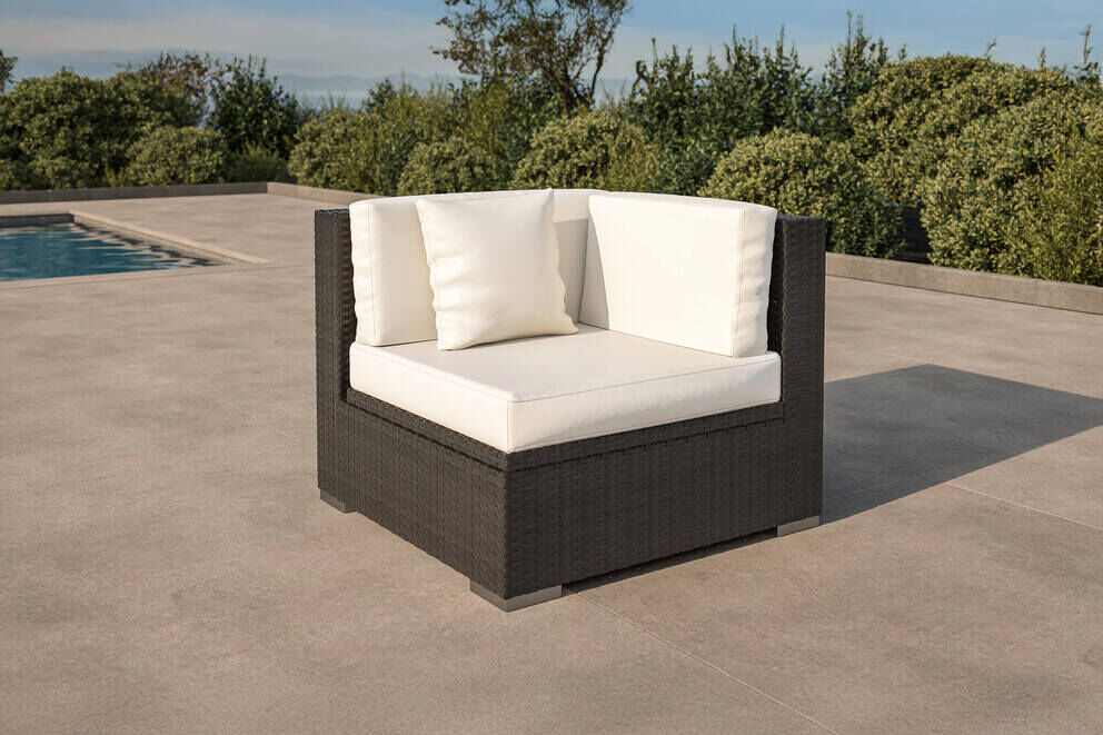 Für Ihre individuelle Gartengestaltung gibt es die ModulemelenteLine, deren einzelne Möbel alle variabel stellbar sind und sich vielfältig kombinieren lassen. Hier erhalten Sie das OUTFLEXX® Eckelement aus der schwarzen Geflechtfaser.