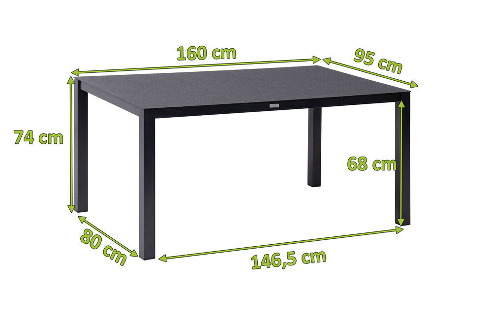 Dieser praktische Esstisch bietet dank seiner Maße von ca. 160 x 95 x 74 cm großzügig Platz für sechs bis acht Personen - so steht einem gemütlichen Mittagessen mit der Familie nichts im Wege. Er wird mit einer ca. 12 mm starken Spraystone Platte geliefert. Spraystone ist ein Kunststoff-Stein-Gemisch, das bei diesem Artikel auf Sicherheitsglas aufgesprüht und anschließend eingebrannt wird. Daraus ergibt sich eine wetter- und kratzfeste sowie pflegeleichte Oberfläche in einer eleganten Natursteinoptik, die sich mit einem milden Reiniger und einem Lappen kinderleicht pflegen lässt. Die Unterschubhöhe des Tisches beträgt ca. 68 cm. Die maximale Belastbarkeit liegt bei ca. 200 kg.