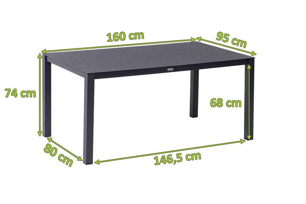 Dieser praktische Esstisch bietet dank seiner Maße von ca. 160 x 95 x 74 cm großzügig Platz für vier bis sechs Personen - so steht einem gemütlichen Mittagessen mit der Familie nichts im Wege. Er wird mit einer ca. 12 mm starken Spraystone Platte geliefert. Spraystone ist ein Kunststoff-Stein-Gemisch, das bei diesem Artikel auf Sicherheitsglas aufgesprüht und anschließend eingebrannt wird. Daraus ergibt sich eine wetter- und kratzfeste sowie pflegeleichte Oberfläche in einer eleganten Natursteinoptik, die sich mit einem milden Reiniger und einem Lappen kinderleicht pflegen lässt. Die Unterschubhöhe des Tisches beträgt ca. 68 cm. Die maximale Belastbarkeit liegt bei ca. 200 kg.