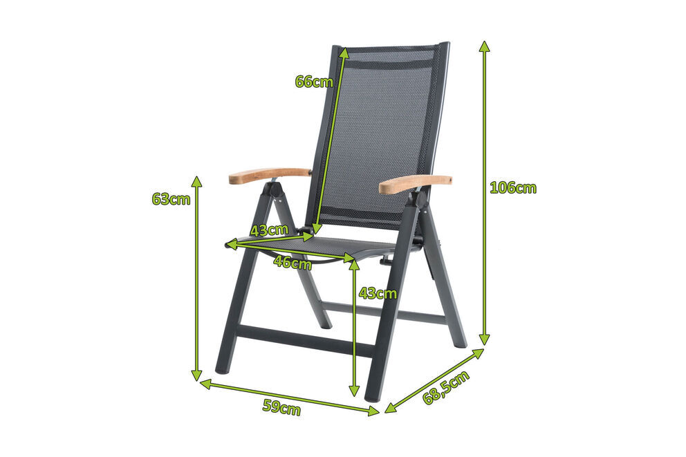 Das Gestell besteht aus korrosionsbeständigem Aluminium im schicken OUTFLEXX® anthrazit matt, während die hautschmeichelnden Armlehnen – aus gebürstetem, natürlichen Teakholz – erhöhten Komfort schenken. Bespannt wird das solide Gestell mit Textilene im passenden Schwarzton. Es ist unglaublich sorgt für ein herrlich luftiges Sitzgefühl, das Sie auch in der Sommerhitze nicht im Stich lässt. Die Gesamtmaße des Sessels liegen bei ca. 68,5 x 59 x 106 cm. Mit einer Sitztiefe von ca. 43 cm sitzen Sie stets komfortabel. Dank der hohen Qualität und erstklassigen Verarbeitung ist der ca. 5,05 kg leichte Sessel bis zu ca. 120 kg belastbar. Sie können den Sessel somit auch ganz nach Bedarf an Ihren Lieblingsplätzen aufstellen, ihn nach der Sonne ausrichten oder auch, wenn nötig, schnell unters Dach oder in den Schatten bringen. Die Klappfunktion macht es einfach Ihren Sessel bis zu seinem nächsten Einsatz zu verstauen.