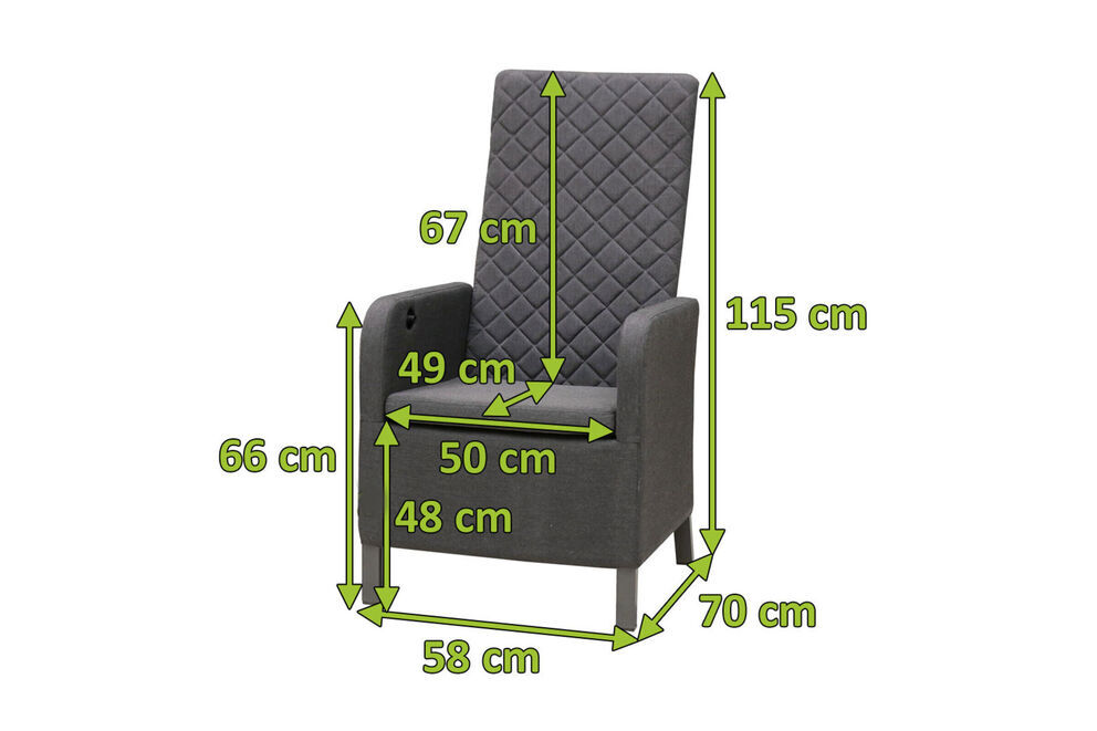 Auf diesem gemütlichen Sessel von OUTFLEXX® können Sie mit einem guten Buch in der Sonne sitzen und nach einem langen Arbeitstag entspannen. Der Sessel hat ein Gesamtmaß von ca. 70 x 85 x 115 cm, die Sitzhöhe beträgt ca. 48 cm. Besonders praktisch: Sie können die Rückenlehne ganz bequem verstellen! Einfach den Knopf an der Armlehne drücken, und schon können Sie die Lehne mit etwas Druck zurückstellen - perfekt für schöne Sommertage in der Sonne! Der Oberstoff in der Sunbrellafarbe sooty unterstreicht den einzigartigen Charakter der Möbel. Für das Gestell wird robustes, pulverbeschichtetes Aluminium verwendet, welches mit der Schaumstoff-Sunbrella Kombination eine solide Sitz- und Liegemöglichkeit bietet.