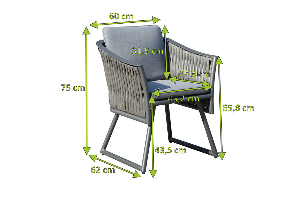 Der bequeme Sessel verfügt über ein Gestell aus Aluminium und die Sitz- und Rückenfläche ist bespannt mit OUTFLEXX® XL Geflecht (Tube Wicker ca. 3 x 4 cm dick ). Mit den Maßen von ca. 60 x 62 x 75 cm und einem Gewicht von ca. 8,3 kg bietet dieser Sessel genügend Platz um es sich so richtig gemütlich zu machen. Abgerundet werden die gemütlichen Stunden durch die komfortablen aus Polyester gefertigten grauen Sitz- und Rückenpolster mit einer Dicke von ca. 5 cm, sodass Sie gar nicht mehr aufstehen möchten. Die Bezüge der Polster sind abnehmbar und können auch gewaschen werden, falls diese einmal dreckig werden. Die angepasste Sitzhöhe inklusive Polster von ca. 43,5 cm bringt Ihre Sitzgelegenheiten in perfektem Einklang zu jedem Esstisch.