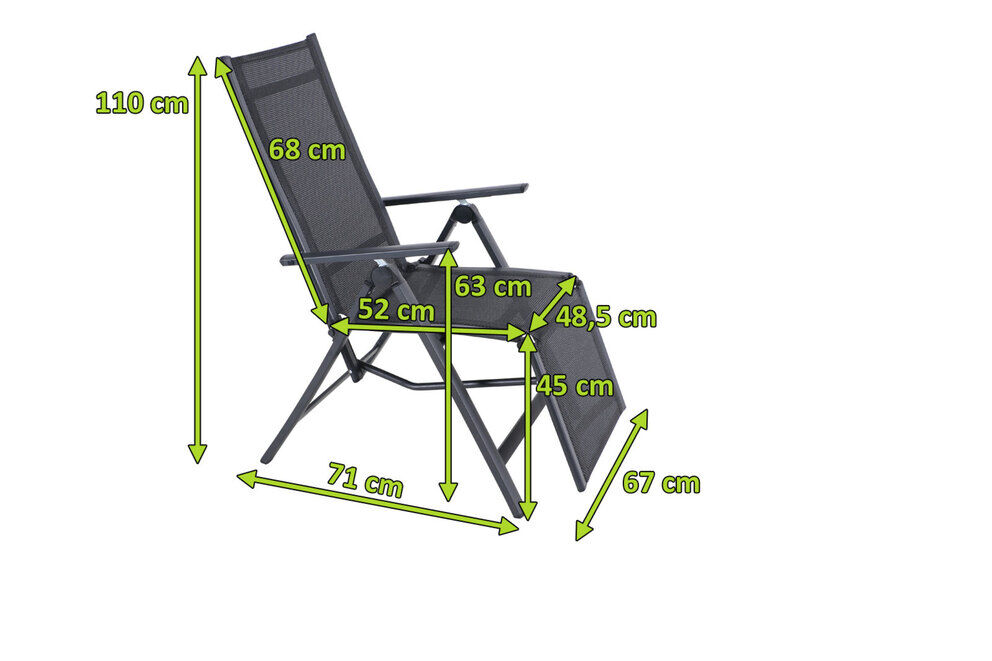 Auch im ausgeklappten Zustand ist dieser Relaxsessel ein bemerkenswerter Formwandler. Er ist im Stande Ihnen 7 unterschiedliche Sitz- und Liegepositionen anzubieten. Zum weiteren Ausbau Ihrer Komfortzone wird mit dem Senken der Rückenlehne die integrierte Fußablage im gleichen Maße angehoben. Sitzfläche und Rückenlehne sind mit dem Material Textilene in der Farbe schwarz bespannt. Das Kunststoffgewebe zeichnet sich vor allem durch seine hohe Belastbarkeit und seinen hohen Komfort aus. Zudem ist es frost- und hitzebeständig, was zusammen mit der hohen Lichtbeständigkeit für eine lange Attraktivität Ihrer Sitzmöbel sorgt. Auch nimmt Textilene kaum Feuchtigkeit auf, so dass die Sitzfläche nach einem Regenschauer schnell wieder trocken ist.