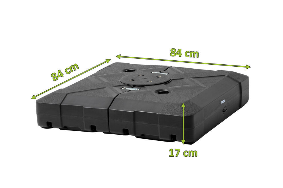 Der schicke Schirmständer aus hochwertigem HDPE-Kunststoff in Anthrazit hat eine stattliche Größe von ca. 84 x 84 x 17 cm, die für Stabilität sorgt. Durch sein geringes Leergewicht können Sie den Ständer leicht an Ihrem Lieblingsplatz stellen, er lässt sich jedoch leicht auf ein Mindestgewicht von ca. 100 kg befüllen. Welches Schirmständer-Gewicht Ihr Schirm im Speziellen benötigt, entnehmen Sie bitte der Artikelbeschreibung.