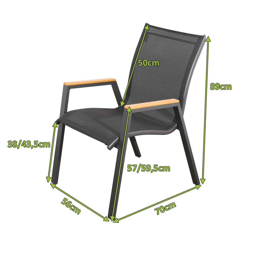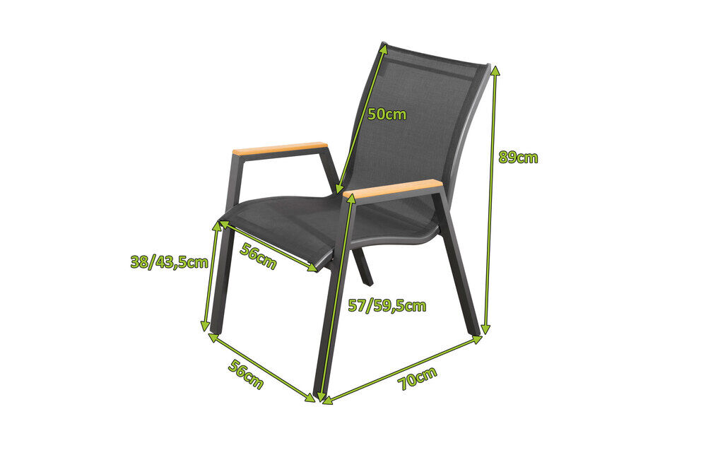 Die Sitzfläche und Rückenlehne sind mit dem Material Textilene in der Farbe schwarz bespannt. Das Kunststoffgewebe zeichnet sich vor allem durch seine hohe Belastbarkeit und seinen hohen Komfort aus. Zudem ist es frost- und hitzebeständig, was zusammen mit der hohen Lichtbeständigkeit für eine lange Attraktivität Ihrer Sitzmöbel sorgt. Auch nimmt Textilene kaum Feuchtigkeit auf, so dass die Sitzfläche nach einem Regenschauer schnell wieder trocken ist. Zusätzliche Fußkappen vermeiden unschöne Kratzer auf Ihrer Terrasse und bieten zugleich Schutz für das Gestell.