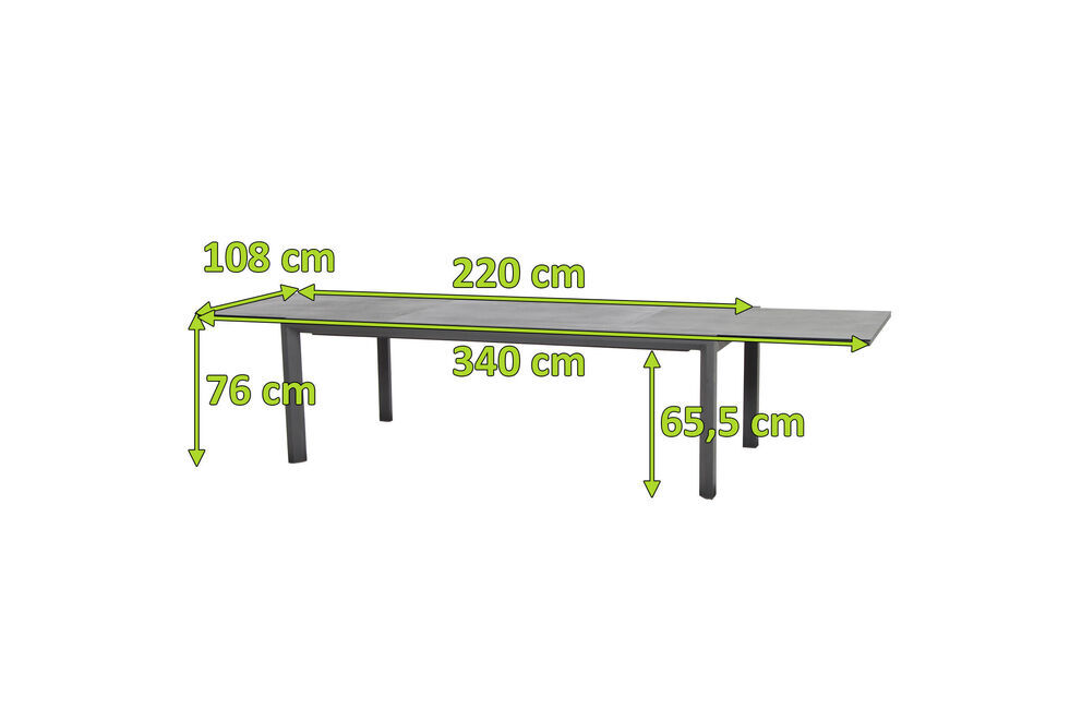 Wer das Besondere liebt ist mit diesem Ausziehtisch bestens bedient. Der Tisch bietet mit seinen Maßen von ca. 220/340x108x76 cm Platz für 8-10 Personen - so steht dem gemütlichen Mittagessen mit der Familie nichts mehr im Wege. Das Gestell wurde aus pulverbeschichtetem Aluminium in matt graphit hergestellt, was den Tisch besonders haltbar macht. Die Tischplatte besteht aus Glas Keramikpulver beschichtet in slate look. Die Unterschubhöhe beträgt ca. 65,5 cm - so kann man gemütlich mit vielen Arten von Sesseln an diesem Tisch Platz nehmen. Der Tisch hat ein Gewicht von ca. 73 kg, und ist somit perfekt gegen Windstöße geschützt.