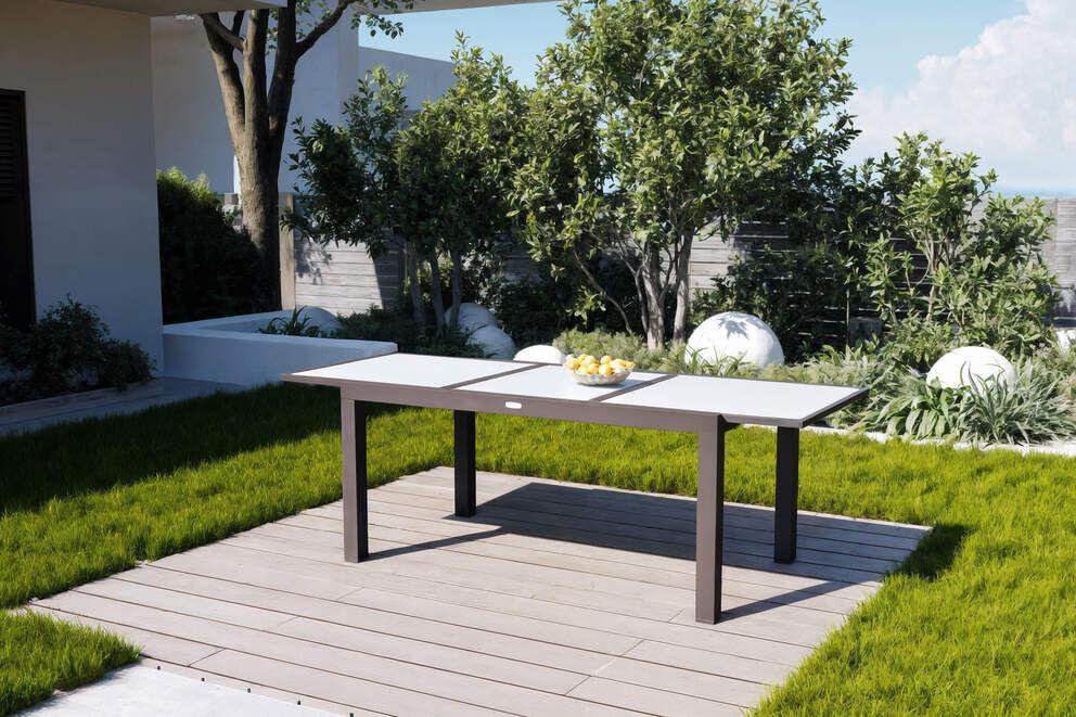 Wer das Besondere liebt und gerne auf jede Gelegenheit vorbereitet sein möchte, ist bei diesem Villana Ausziehtisch genau richtig. Der Tisch ist ca. 90 cm breit und ca. 75 cm hoch, im normalen Zustand hat er eine Länge von ca. 160 cm - so steht einem gemütlichen Mittagessen mit der Familie nichts im Wege. Das pulverbeschichtete Aluminiumgestell des Tisches kommt in einem attraktiven Anthrazitton daher, die ca. 5 mm dicke Tischplatte aus Sicherheitsglas ist weiß. Die Platte zum Erweitern des Tisches ist ebenfalls aus ca. 5 mm dickem Sicherheitsglas gefertigt und lässt sich durch einen Flügelmechanismus ausklappen. Man zieht einfach die beiden oberen Platten auseinander und klappt die darunterliegende Platte nach oben, und schon ist der Tisch auf ca. 220 cm erweitert - perfekt für spontane, große Runden. Die Fußkappen sind aus schwarzem Kunststoff und schützen den Boden vor unschönen Kratzern beim Verrücken des Tisches, die silbernen Schrauben aus galvanisiertem Stahl runden die Optik des Tisches perfekt ab. Ein wirklich schönes Möbelstück, das Ihren Garten oder Ihre Terrasse besonders macht.