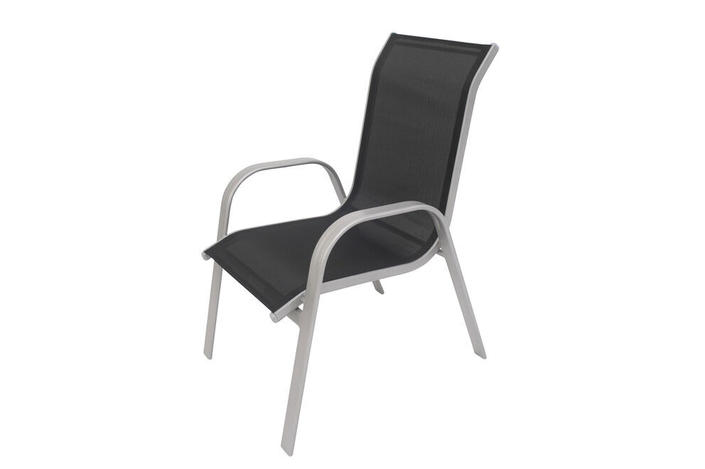 Dieser Villana Gartenstuhl verfügt über ein hochwertiges, silberfarben pulverbeschichtetes Aluminiumgestell, auf welches ein formstabiles Textil-Gewebe 2x1 (70% Polyvinylchlorid / 30% Polyester) in Schwarz aufgespannt wurde. Dadurch ist der Sessel sowohl wetterfest als auch pflegeleicht und sichert optimalen Komfort. Mit Maßen von ca. 75 x 57 x 95 cm und einem Gewicht von nur ca. 2,9 kg lässt sich der Stuhl ganz leicht hin und her stellen. Gleichzeitig bietet er die nötige Stabilität und dank der durchgehenden Sitz- und Rückenfläche einen angenehmen Sitzkomfort. Mit einer Belastbarkeit von bis zu ca. 130 kg ist der praktische Sessel besonders robust und für erholsame Stunden in der Sonne einsatzbereit. Die Fußkappen sind aus silbernem Kunststoff und schützen den Boden vor unschönen Kratzern beim Verrücken des Stuhles, die silbernen Schrauben aus galvanisiertem Stahl runden die Optik perfekt ab. Der Gartenstuhl eignet sich perfekt für Jeden, der zwar auch gern allein oder zu Zweit den Komfort der eigenen Terrasse genießt, aber auch auf spontanen Besuch vorbereitet sein möchte - bis dahin lassen sich die Stühle beispielsweise in einem Gartenschuppen oder an einem anderen Ort gestapelt einlagern und nehmen so sehr wenig Platz ein.