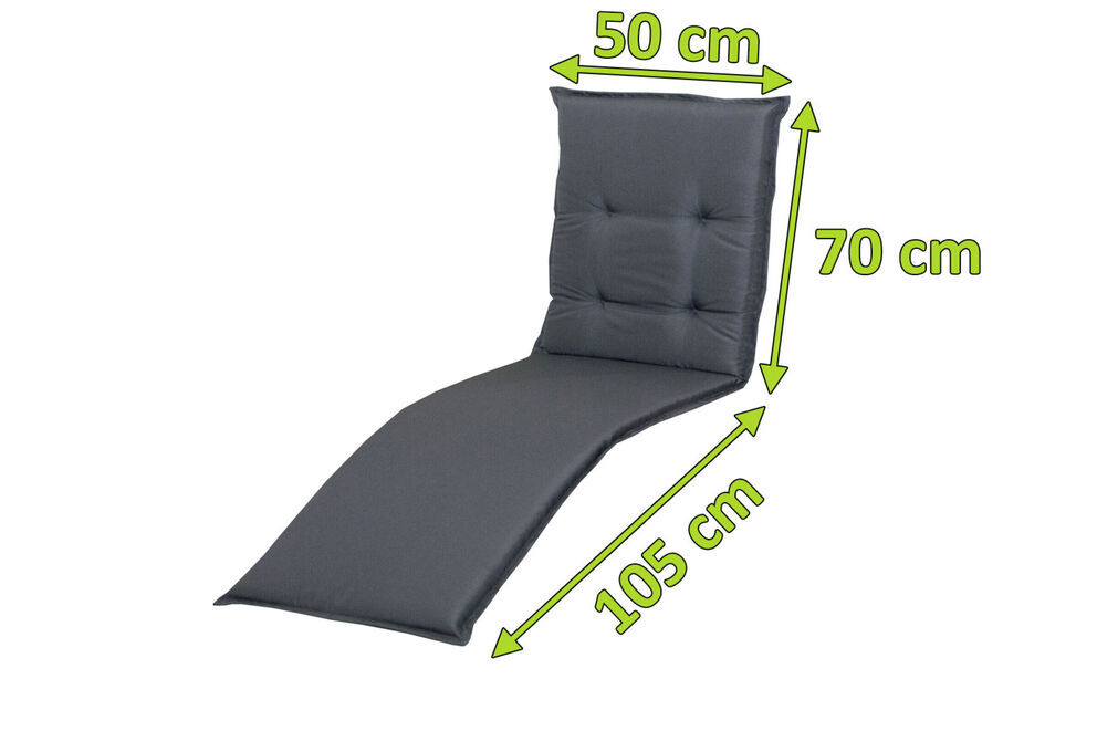 Der Bezug wird aus 100% Polyester gefertigt und bietet, dank des klassischen Designs in Anthrazit und den ziervollen Steppnähten, ein optisches Highlight für Ihren Sessel. Durch das Haltegummi an der Rückseite und die Bindekordeln an der Sitzfläche lässt sich die Auflage kinderleicht fixieren und verhindert so leichtes verrutschen, auch wenn der Sessel über eine glatte Oberfläche verfügt. Dank der Maße von ca. 175 x 50 cm passt sich die Auflage perfekt an die meisten Relaxsessel an. Der Komfort kommt selbstverständlich nicht zu kurz - dafür sorgt der weiche, ca. 7 cm starke Kern, bestehend aus einer Schaum- und Polyestervliesfüllung. Diese edle Auflage macht beim Sonnen stets eine gute Figur.