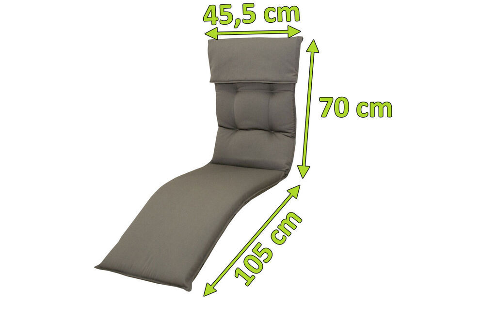 Der Bezug wird aus 100% Acrylfaser (Dralon®) mit Teflon® Markenimprägnierung gefertigt und bietet, dank des klassischen Designs in Anthrazit und den ziervollen Steppnähten, ein optisches Highlight für Ihr Relaxsessel. Durch das Haltegummi an der Rückseite und die Bindekordeln an der Sitzfläche lässt sich die Auflage kinderleicht fixieren und bereitet unnötigem verrutschen, so ein Ende. Dank der Maße von ca. 175 x 45,5 cm passt sich die Auflage perfekt an die meisten Sessel an. Der Komfort kommt selbstverständlich nicht zu kurz - dafür sorgt der weiche, ca. 7 cm starke Kern, bestehend aus einer Schaum- und Polyestervliesfüllung. Diese edle Auflage macht beim Sonnen stets eine gute Figur.