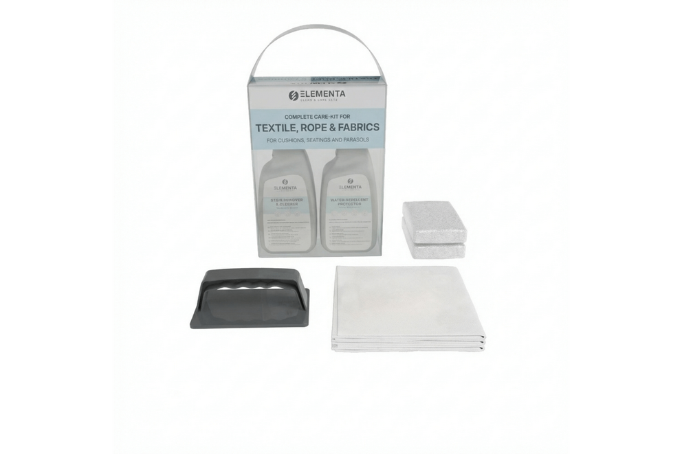 Mit dem ELEMENTA Fabrics KITS 3-in-1 Box – The Complete Care Kit erhalten Sie ein umfassendes Pflegeset, das Ihre hochwertigen Outdoor-Textilien zuverlässig reinigt, schützt und langfristig bewahrt. Ob Kissen, Polsterauflagen, Sonnenschirme oder textile Seilelemente – dieses Set sorgt dafür, dass Ihre Gartenmöbel und Accessoires immer wie neu aussehen.