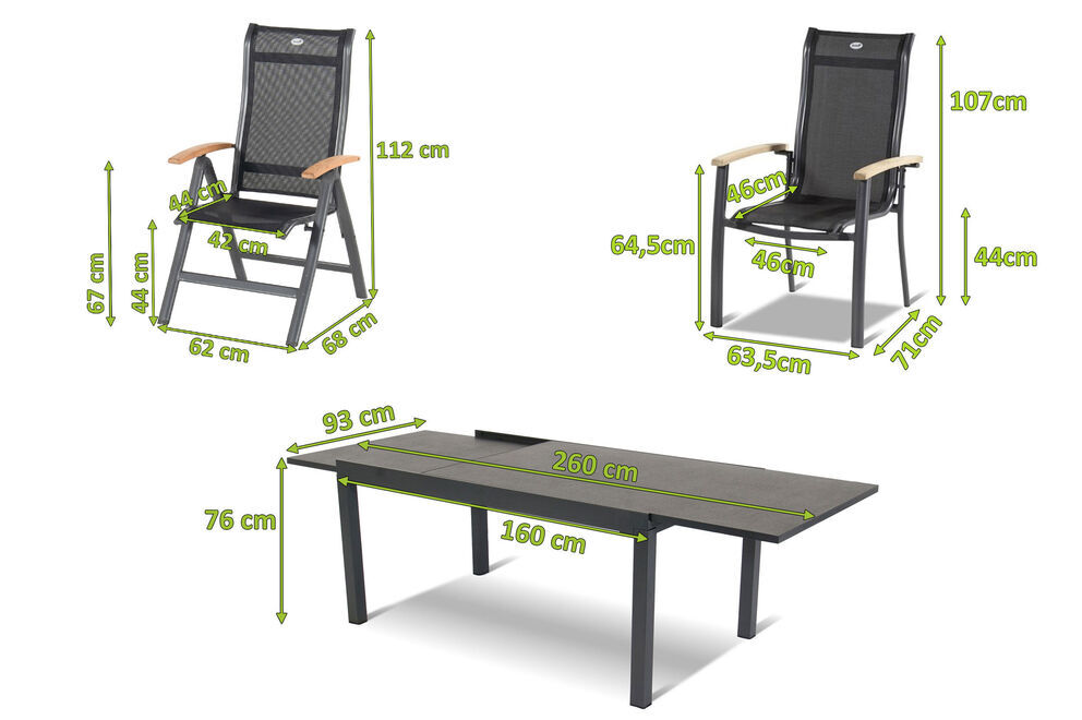 Wer seine Terrasse in neuem Licht erstrahlen lassen möchte, ist mit diesem Komplettset von Hartman bestens beraten. Es besteht aus 4 Stapelsesseln, 2 Multipositionssesseln und einem Ausziehtisch mit einer hochwertigen HPL-Tischplatte. Die unempfindliche steingraue Tischplatte aus stabilem HPL (High Pressure Laminate) ist besonders Kratzfest und leicht zu reinigen. Der Tisch hat die Maße von ca. 160/260 x 93 cm und eine Höhe von ca. 76 cm.