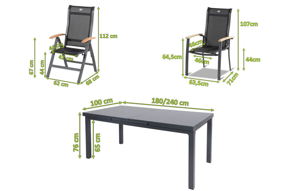 Die Sessel bestechen durch ihre schlichte Optik mit dem pulverbeschichteten Aluminiumrahmen in einem modernen Anthrazit in Kombination mit dem schwarzen Textilen-Gewebe. Ergänzt wird dieses zeitlose Design durch FSC-zertifizierte Teakholz-Armlehnen. Funktional überzeugen hier sowohl die Hochlehner, als auch die Stapelsessel. Die Rückenlehne der Hochlehner lässt sich kinderleicht mehrfach verstellen und bietet damit einen hervorragenden Sitzkomfort. Dank des pulverbeschichteten Aluminiumgestells sind alle Sessel zudem leicht und einfach zu transportieren. Je nach Bedarf können die Hochlehner zusammengeklappt und die Stapelsessel ineinander gestapelt, und somit platzsparend verstaut werden.