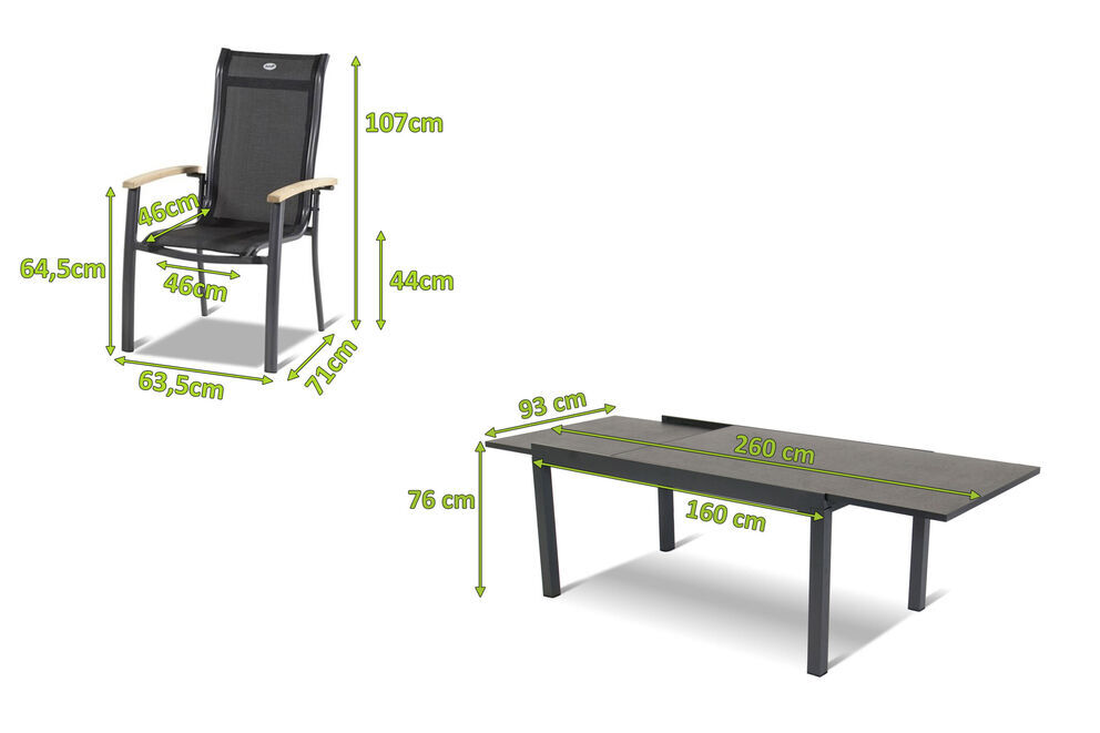Wer seine Terrasse in neuem Licht erstrahlen lassen möchte, ist mit diesem Komplettset von Hartman bestens beraten. Es besteht aus 6 Stapelsesseln und einem Ausziehtisch mit einer hochwertigen HPL-Tischplatte. Die unempfindliche steingraue Tischplatte aus stabilem HPL (High Pressure Laminate) ist besonders Kratzfest und leicht zu reinigen. Der Tisch hat die Maße von ca. 260/160 x 93 cm und eine Höhe von ca. 76 cm.