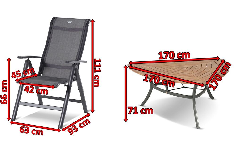 Wer seine Terrasse in neuem Licht erstrahlen lassen möchte, ist mit diesem Komplettset von Hartman bestens beraten. Es besteht aus 6 Multipositionssesseln und einem dreieckigen Esstisch, mit einer hochwertigen Teakholztischplatte. Durch seine besondere Form sitzen sich alle Gäste oder Familienmitglieder gleichmäßig gegenüber, sodass gemütlichen und geselligen Abenden nichts mehr im Wege steht.