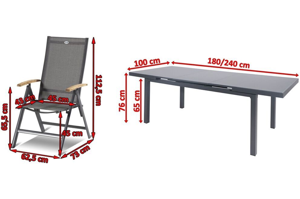 Die Klappstühle bestechen durch ihre schlichte Optik mit dem pulverbeschichteten Aluminiumrahmen in einem modernen Anthrazit in Kombination mit dem ebenfalls anthrazitfarbenen Textilen-Gewebe. Ergänzt wird dieses zeitlose Design durch FSC-zertifizierte Teakholz-Armlehnen. Auch funktional überzeugen die bequemen Gartensessel: Die Rückenlehne lässt sich kinderleicht mehrfach verstellen und bietet damit einen hervorragenden Sitzkomfort. Dank des pulverbeschichteten Aluminiumgestells sind die Sessel zudem leicht und einfach zu transportieren. Je nach Bedarf können die Hochlehner schnell und einfach zusammengeklappt und platzsparend verstaut werden.