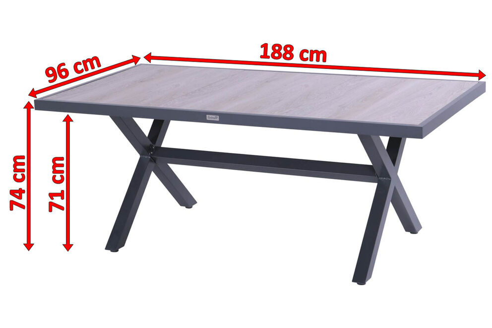 Das Gestell ist gefertigt aus pulverbeschichtetem Aluminium in der Farbe Xerix (Anthrazit) und wird optisch perfekt durch die Keramik-Tischplatte in der Farbe Beige Wood ergänzt. Die großzügigen Maße von ca. 188 x 96 x 74 cm sorgen dafür, dass stets ausreichend Ablagefläche zur Verfügung steht und bequem 8 Personen genügend Platz finden.