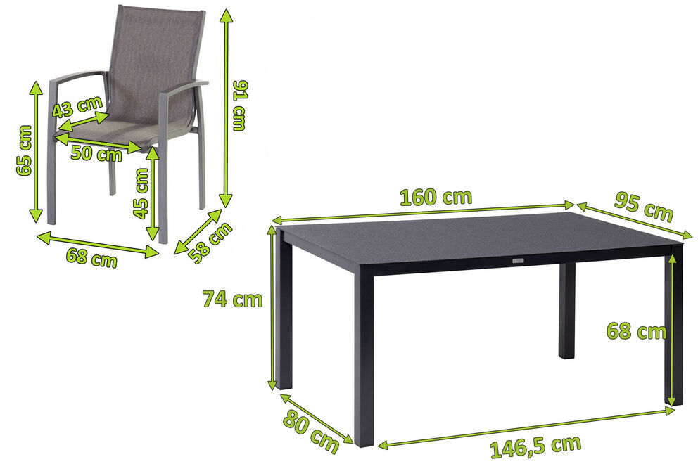Dieser praktische Esstisch bietet dank seiner Maße von ca. 160 x 95 x 74 cm großzügig Platz für sechs bis acht Personen - so steht einem gemütlichen Mittagessen mit der Familie nichts im Wege. Er wird mit einer ca. 12 mm starken Spraystone Platte geliefert. Spraystone ist ein Kunststoff-Stein-Gemisch, das bei diesem Artikel auf Sicherheitsglas aufgesprüht und anschließend eingebrannt wird. Daraus ergibt sich eine wetter- und kratzfeste sowie pflegeleichte Oberfläche in einer eleganten Natursteinoptik, die sich mit einem milden Reiniger und einem Lappen kinderleicht pflegen lässt. Die Unterschubhöhe des Tisches beträgt ca. 68 cm. Die maximale Belastbarkeit liegt bei ca. 200 kg.