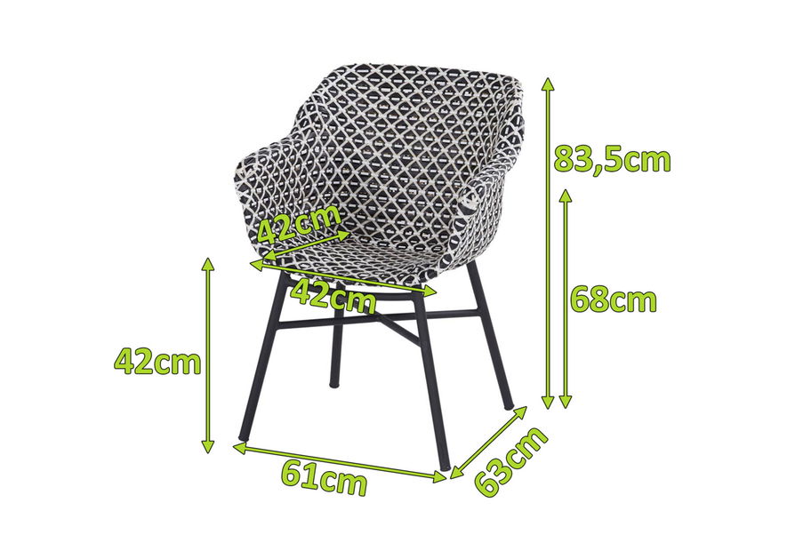 Der 'Delphine' Armlehnensessel mit Maßen von ca. 63 x 61 x 83,5 cm (L/B/H) bietet außerordentlichen Sitzkomfort. Das bequeme, um ein Aluminiumgestell geflochtene Kunststoffgeflecht aus Polypropylen passt sich perfekt Ihrem Körper an und sorgt so für ein rundum angenehmes Sitzgefühl. Armlehnen sorgen dabei für zusätzlichen Komfort und machen das Sitzen zu einem wahren Erlebnis, während die Fußkappen an den Stuhlbeinen unschöne Kratzer auf Ihrem Terrassenboden vermeiden.