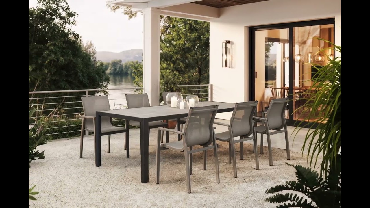 Dank pulverbeschichtetem Aluminiumgestell, pflegeleichter Keramik-Tischplatte und schnelltrocknender Textilene-Bespannung ist die Essgruppe optimal für den ganzjährigen Einsatz im Freien geeignet – langlebig, robust und korrosionsbeständig. |