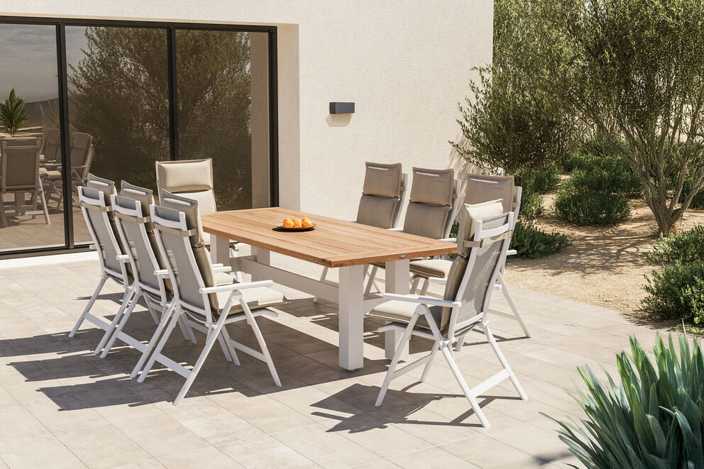 Die Kombination aus weißem Aluminiumgestell und naturfarbener Teakholzplatte verleiht Ihrer Terrasse ein modernes, elegantes Ambiente mit warmem Naturcharakter. Ideal für stilbewusste Gartenliebhaber, die Wert auf hochwertige Materialien und zeitlose Ästhetik legen. |