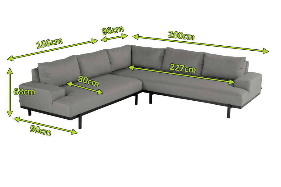 Sie überzeugt durch das Gestell aus pulverbeschichtetem Aluminium in Verbindung mit Sunbrella in der Farbe flanelle. Das Zusammenspiel der verwendeten Materialien gibt dieser Lounge ihr einzigartiges und hochwertiges Aussehen. Dank der robusten Materialien kann die Lounge problemlos das ganze Jahr über im Freien stehen bleiben. Das Set besteht aus einem 3-Sitzer Sofa (ca. 260 x 96 x 68 cm) und einem 2-Sitzer Sofa mit einer Armlehne (ca. 166 x 96 x 68 cm). Die Möbel lassen sich einzeln stellen oder ganz einfach zu einer Ecklounge miteinander verbinden.