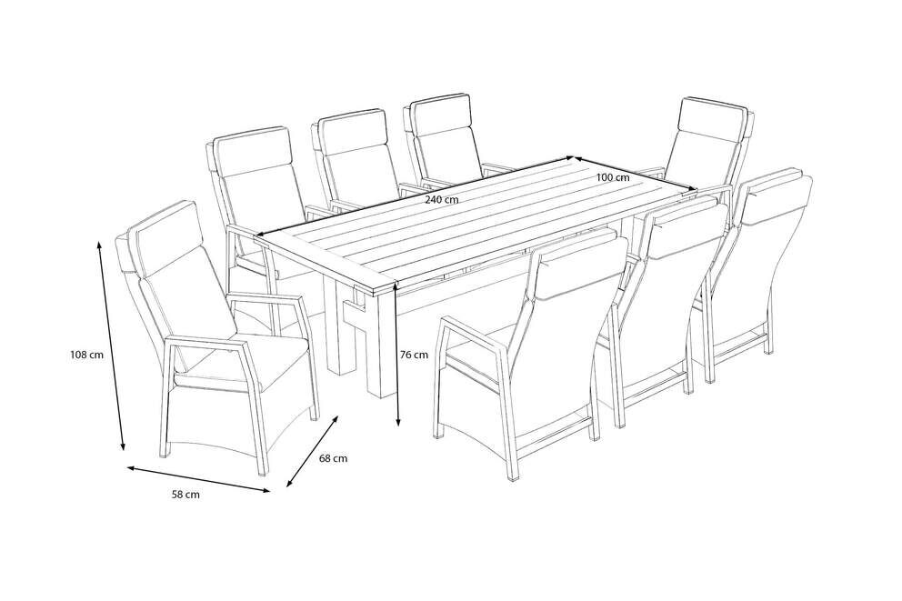 Die acht OUTFLEXX Nova Diningsessel ergänzen den Tisch perfekt. Gefertigt aus einem stabilen, pulverbeschichteten Aluminiumgestell und einem hochwertigen Polyrattan-Geflecht in Anthrazit/Grau, überzeugen die Stühle nicht nur durch ihre elegante Optik, sondern auch durch ihre Widerstandsfähigkeit gegenüber Witterungseinflüssen. Die ergonomische, hohe Rückenlehne sorgt für besonderen Sitzkomfort und lässt sich mit einem Knopf unter der Armlehne flexibel verstellen – ideal für entspannte Stunden am Esstisch. Mit einer Breite von ca. 68 cm, einer Tiefe von ca. 58 cm und einer Höhe von ca. 108 cm bieten die Stühle ein komfortables Sitzgefühl. Die Sitzhöhe inklusive Kissen liegt bei ca. 45 cm. Dank des geringen Gewichts von ca. 11 kg sind die Sessel zudem leicht zu handhaben.
