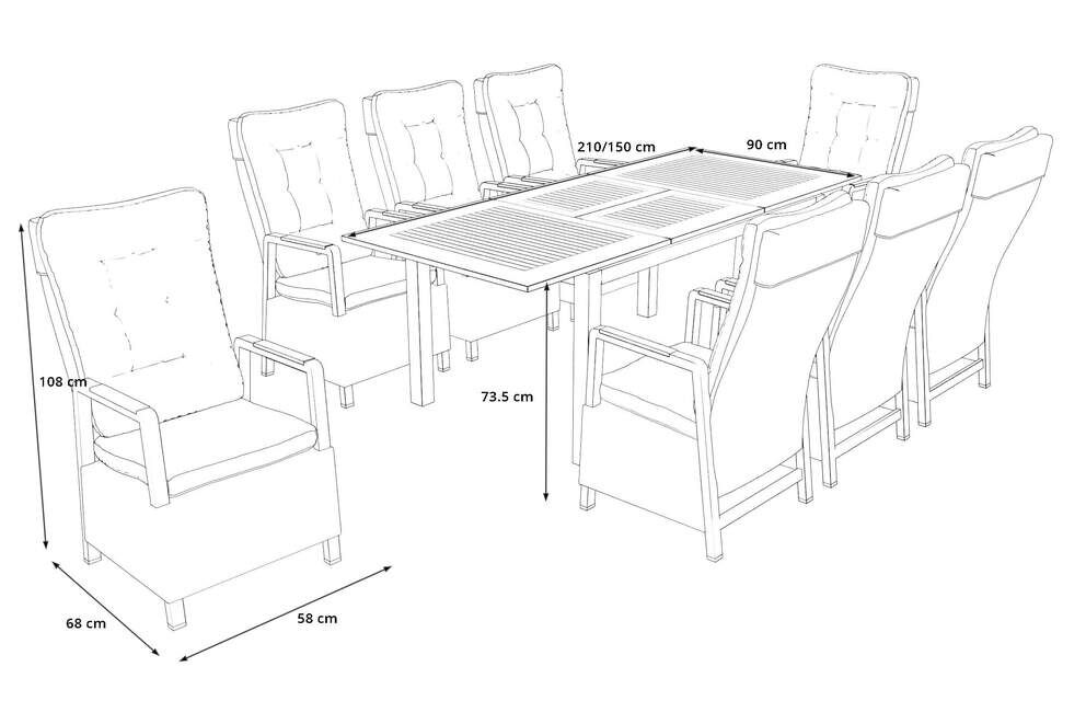 Pulverbeschichtetes Aluminium, edles Teakholz und modernes Polyrattan machen die Essgruppe langlebig und pflegeleicht. Die Kombination sorgt für Stabilität, edle Optik und eine witterungsbeständige Nutzung im Außenbereich. |