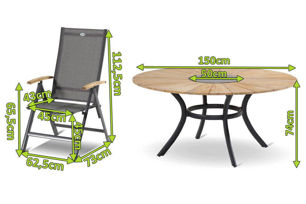 Der Tisch ist gefertigt aus pulverbeschichtetem Aluminium in der Farbe Xerix (Anthrazit) und wird optisch perfekt durch die runde Tischplatte aus SVLK-zertifiziertem Teakholz ergänzt. Die Maße von ca. Ø 150 x 74 cm sorgen dafür, dass stets ausreichend Ablagefläche zur Verfügung steht und Ihre Gäste bequem genügend Platz finden. Das Highlight dieses Tisches ist das Granitinlay, das bei Bedarf problemlos herausgenommen und durch den im Lieferumfang enthaltenen Eiskühler ausgetauscht werden kann. So haben Sie auch bei sommerlichen Temperaturen stets gekühlte Getränke direkt zur Hand. Mit den Klappstühlen aus der Aruba Serie kommt die perfekte Kombination aus Stil und Komfort in den heimischen Garten - denn das Modell besticht nicht nur durch den robusten Aluminiumrahmen und die hochwertigen Armlehnen aus FSC®-Teakholz, sondern auch durch die justierbare Rückenlehne, die aufrecht wie zurückgelehnt herausragenden Komfort bietet. Mit Maßen von ca. 73 x 62,5 x 112,5 cm, einer Sitzhöhe von ca. 45 cm und einer Sitzfläche von ca. 45 x 43 cm passt er perfekt zum Tisch. Die Sessel sind in einem edlen xerix / anthrazit gehalten, lediglich die Armlehnen aus FSC®-zertifiziertem Teak sind farblich hervorgehoben. Die verwendeten Materialien sind extrem witterungsbeständig und pflegeleicht, daher können die Möbel auch bei schlechtem Wetter ohne Probleme auf Ihrer Terrasse stehen bleiben. Teakholz hat aufgrund des hohen Anteils an holzeigenen Ölen einen natürlichen Schutz gegen Pilze und Schädlinge. So beschränkt sich die Pflege Ihrer neuen Möbel auf ein Minimum und Sie können Ihre Zeit im Garten mit angenehmen Tätigkeiten verbringen. Die 4x4 Textilenbespannung (70% Polyvinylchlorid, 30% Polyester) der Sessel ist beständig gegen UV-Strahlung, sodass die Farben lange frisch aussehen. Außerdem trocknet sie nach einem kurzen Schauer sehr schnell. Falls die Sessel aber doch mal weggeräumt werden sollen, können sie schnell und einfach zusammengeklappt und platzsparend verstaut werden. Zum Schutz Ihrer Terrasse sind die Sessel und der Tisch mit Fußkappen ausgestattet, welche unschöne Kratzer auf dem Boden vermeiden. Die FSC® bzw. SVLK-Zertifizierung der Möbel garantiert Ihnen, dass das Holz aus verantwortungsvollen Quellen stammt, sodass Sie sich entspannt zurücklehnen und Ihren neuen Gartenstuhl so richtig genießen können.