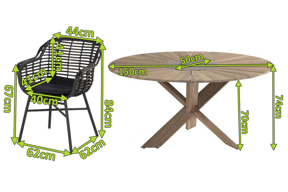 Der Tisch besteht aus hochwertigem, recyceltem und SVLK-zertifiziertem Teakholz in der Farbe Light Grey und wertet mit seinem rustikalen Design das Gesamtbild Ihrer Sitzgruppe um einiges auf. Die Maße von ca. Ø 150 x 74 cm sorgen dafür, dass stets ausreichend Ablagefläche zur Verfügung steht und Ihre Gäste bequem genügend Platz finden. Das Highlight dieses Tisches ist das Granitinlay, welches zum Beispiel das Abstellen heißer Töpfe ermöglicht.