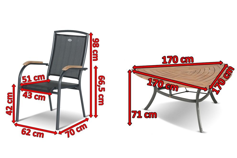 Wer seine Terrasse in neuem Licht erstrahlen lassen möchte, ist mit diesem Komplettset von Hartman bestens beraten. Es besteht aus 6 Stapelsesseln und einem dreieckigen Esstisch, mit einer hochwertigen Teakholztischplatte. Durch seine besondere Form sitzen sich alle Gäste oder Familienmitglieder gleichmäßig gegenüber, sodass gemütlichen und geselligen Abenden nichts mehr im Wege steht.