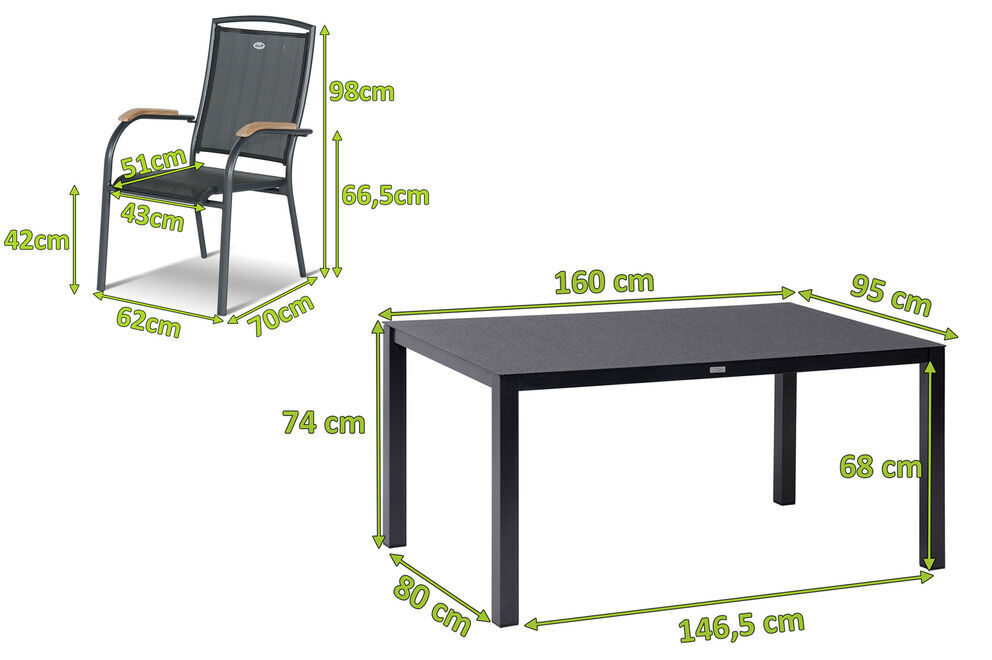 Bei dieser Esstischgruppe treffen hochwertige Materialien und Design auf modernste Weise aufeinander. Das Set besteht aus einem innovativen Esstisch der Marke OUTFLEXX mit den Maßen von ca. 160x95x74 cm und 6 Stapelsessel, der Marke HARTMAN aus der Serie 'Raffaelo '.