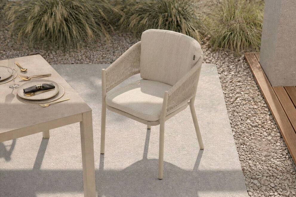 Der HARTMAN Shades of Colour Altea Diningsessel vereint modernes Design, hohen Sitzkomfort und hochwertige Materialien zu einem Gartenmöbel, das Ihrem Außenbereich eine stilvolle und einladende Atmosphäre verleiht. Mit seinem harmonischen Zusammenspiel aus sand/beigen Farbtönen, dem fein geflochtenen Rope-Geflecht und dem robusten Gestell präsentiert sich dieser Diningsessel als besonderes Highlight für Terrassen, Gärten und Loggien. Die geschwungene Formensprache sowie die sanfte Linienführung unterstreichen den eleganten Charakter des Sessels und machen ihn zu einem attraktiven Blickfang in jeder Outdoor-Gestaltung.