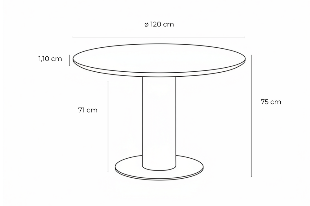 Durch seinen Durchmesser von ca. 120 cm bietet der Esstisch ausreichend Platz für gesellige Runden mit Familie oder Freunden. Die klare Linienführung, die runde Form und die sanfte Farbgebung schaffen ein einladendes Ambiente, das sowohl zeitlos als auch modern wirkt. Besonders ins Auge fällt die solide Mittelsäule aus Aluminium, die dem Tisch eine stabile Standfestigkeit verleiht und zugleich die Beinfreiheit der Sitzenden maximiert. Die runde Bodenplatte sorgt zusätzlich für ein ruhiges, ausgewogenes Erscheinungsbild und unterstützt die zuverlässige Stabilität.