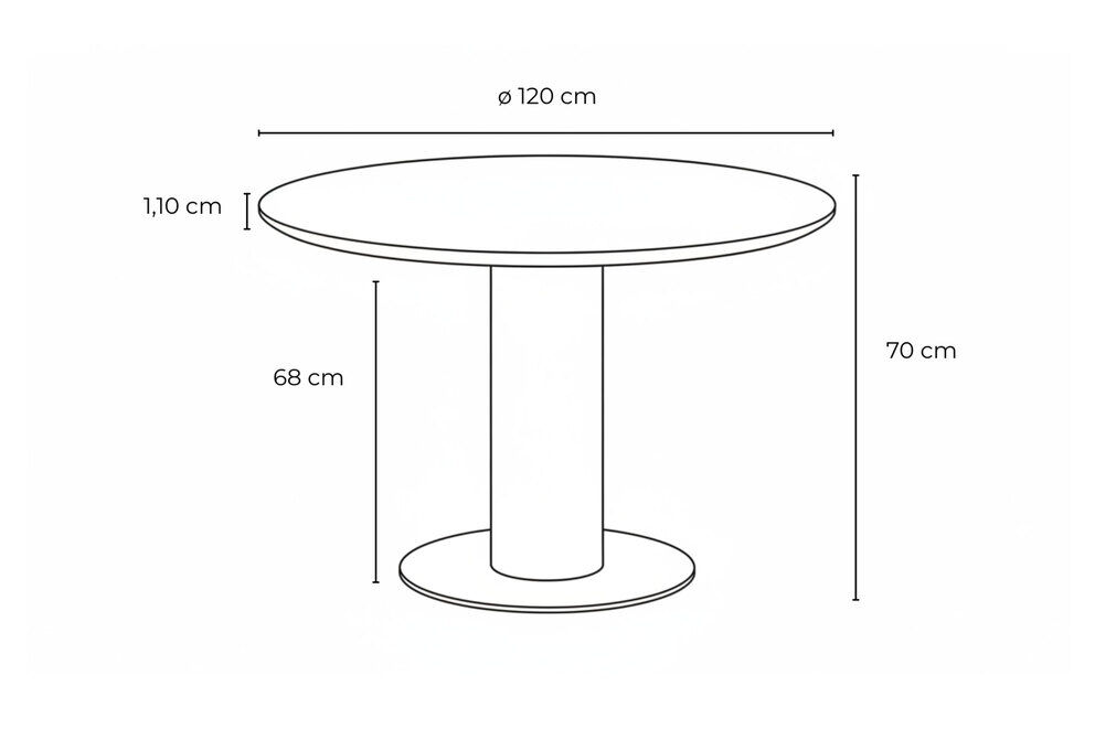 Mit einem Durchmesser von ca. 120 cm lädt die runde Tischform zu geselligen Momenten ein. Alle Sitzenden genießen eine gleichwertige Position, wodurch der Tisch ideal für kommunikative Runden und harmonisches Beisammensein ist. |