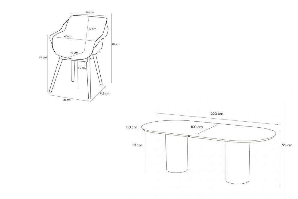 Herzstück der Garten-Essgruppe ist der ovale Esstisch mit einer ca. 220 x 100 cm großen Keramik-Tischplatte in Anthrazit. Die elegante, durchgehende Form wirkt modern und sorgt gleichzeitig für eine angenehme, kommunikative Sitzanordnung. Mit einer Höhe von ca. 75 cm bietet der Tisch komfortable Beinfreiheit und ausreichend Platz für bis zu sechs Personen. Die kratzfeste und hitzebeständige Keramikoberfläche ist besonders pflegeleicht und ideal für den täglichen Einsatz im Freien geeignet.