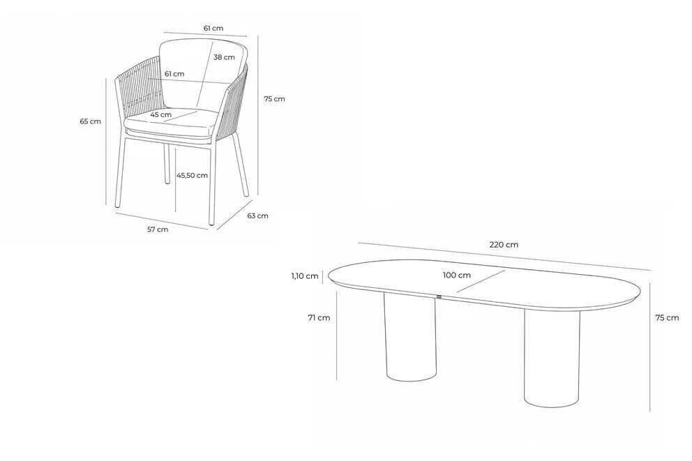 Herzstück des Sets ist der großzügige Esstisch mit einer ca. 220 x 100 cm großen, ovalen Keramik-Tischplatte. Die sanft gerundete Form unterstützt eine kommunikative Sitzanordnung und sorgt für eine angenehme Optik ohne harte Kanten. Die Keramikoberfläche ist kratzfest, hitzebeständig und pflegeleicht – ideal für den täglichen Einsatz im Außenbereich. Zwei stabile Säulen aus Aluminium in cappuccino tragen die Tischplatte und verleihen dem Tisch bei einer Höhe von ca. 75 cm einen sicheren Stand. Das Gesamtgewicht von ca. 77,7 kg unterstreicht die solide Konstruktion.