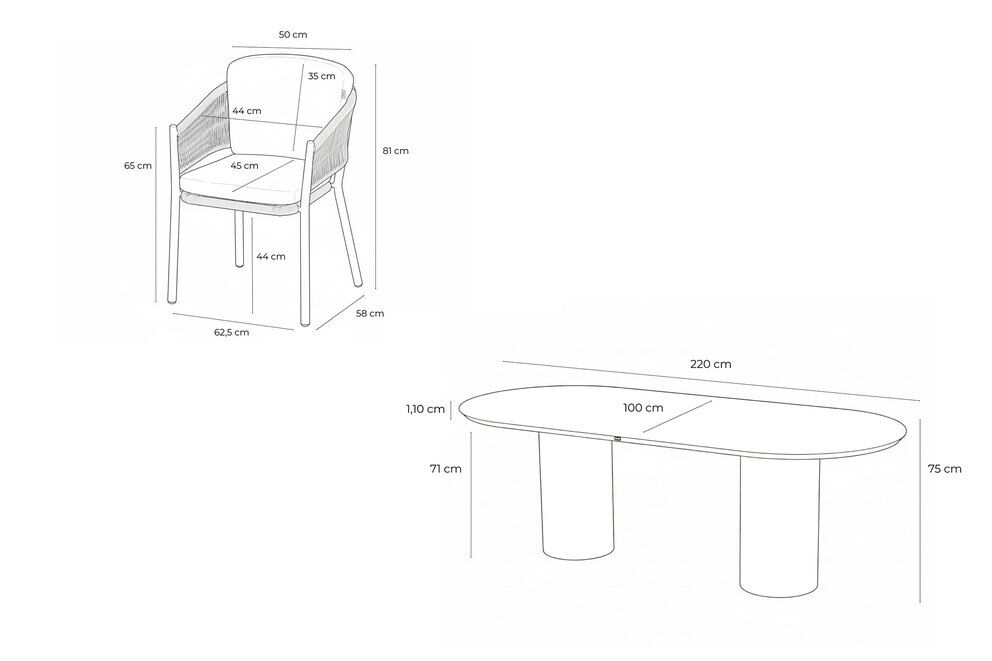 Die Maße der Einzelkomponenten sind auf komfortables Speisen ausgelegt: Der Tisch misst ca. 220 x 100 cm bei einer Höhe von ca. 75 cm. Ein Diningsessel kommt auf ein Gesamtmaß von ca. 58 x 62 x 81 cm, eine Sitzhöhe von ca. 44 cm sowie eine Belastbarkeit von ca. 135 kg. Das Sitzkissen hat ca. 45 x 43 cm, das Rückenkissen ca. 35 x 50 cm – abgestimmt auf die Sessel für einen rundum stimmigen Look.