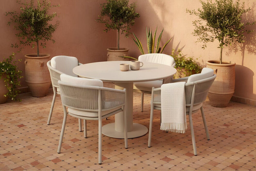 Die vier passenden Diningsessel greifen die elegante Farbgebung in sandfarbenem Beige auf und kombinieren ein pulverbeschichtetes Aluminiumgestell mit einem luftdurchlässigen Rope-Geflecht. Dieses Geflecht verleiht den Sesseln eine moderne, filigrane Optik und sorgt gleichzeitig für Stabilität und Langlebigkeit. Die ergonomisch geformte Rückenlehne unterstützt eine angenehme Sitzhaltung und macht lange Abende am Tisch besonders komfortabel.