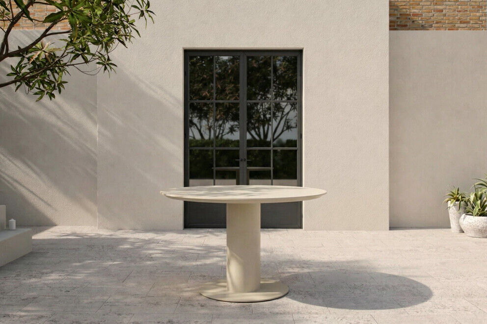 Durch seinen Durchmesser von ca. 120 cm bietet der Esstisch ausreichend Platz für gesellige Runden mit Familie oder Freunden. Die klare Linienführung, die runde Form und die sanfte Farbgebung schaffen ein einladendes Ambiente, das sowohl zeitlos als auch modern wirkt. Besonders ins Auge fällt die solide Mittelsäule aus Aluminium, die dem Tisch eine stabile Standfestigkeit verleiht und zugleich die Beinfreiheit der Sitzenden maximiert. Die runde Bodenplatte sorgt zusätzlich für ein ruhiges, ausgewogenes Erscheinungsbild und unterstützt die zuverlässige Stabilität.