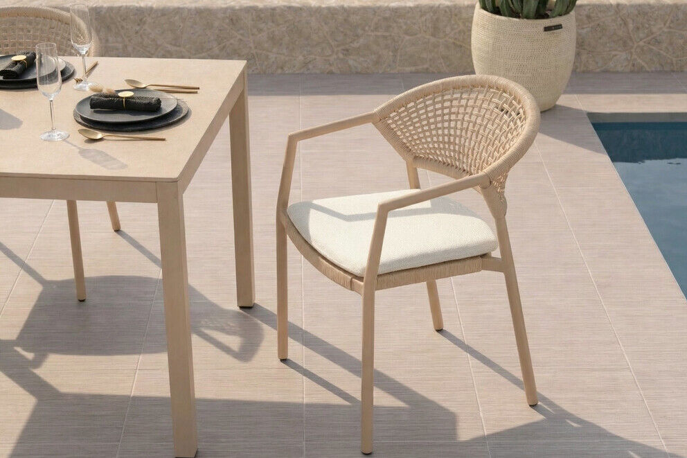 Die cappuccino/beige Farbgebung wirkt warm und natürlich. In Kombination mit der offenen Rope-Struktur entsteht ein stilvolles, hochwertiges Gesamtbild, das Outdoor-Bereiche optisch aufwertet. |